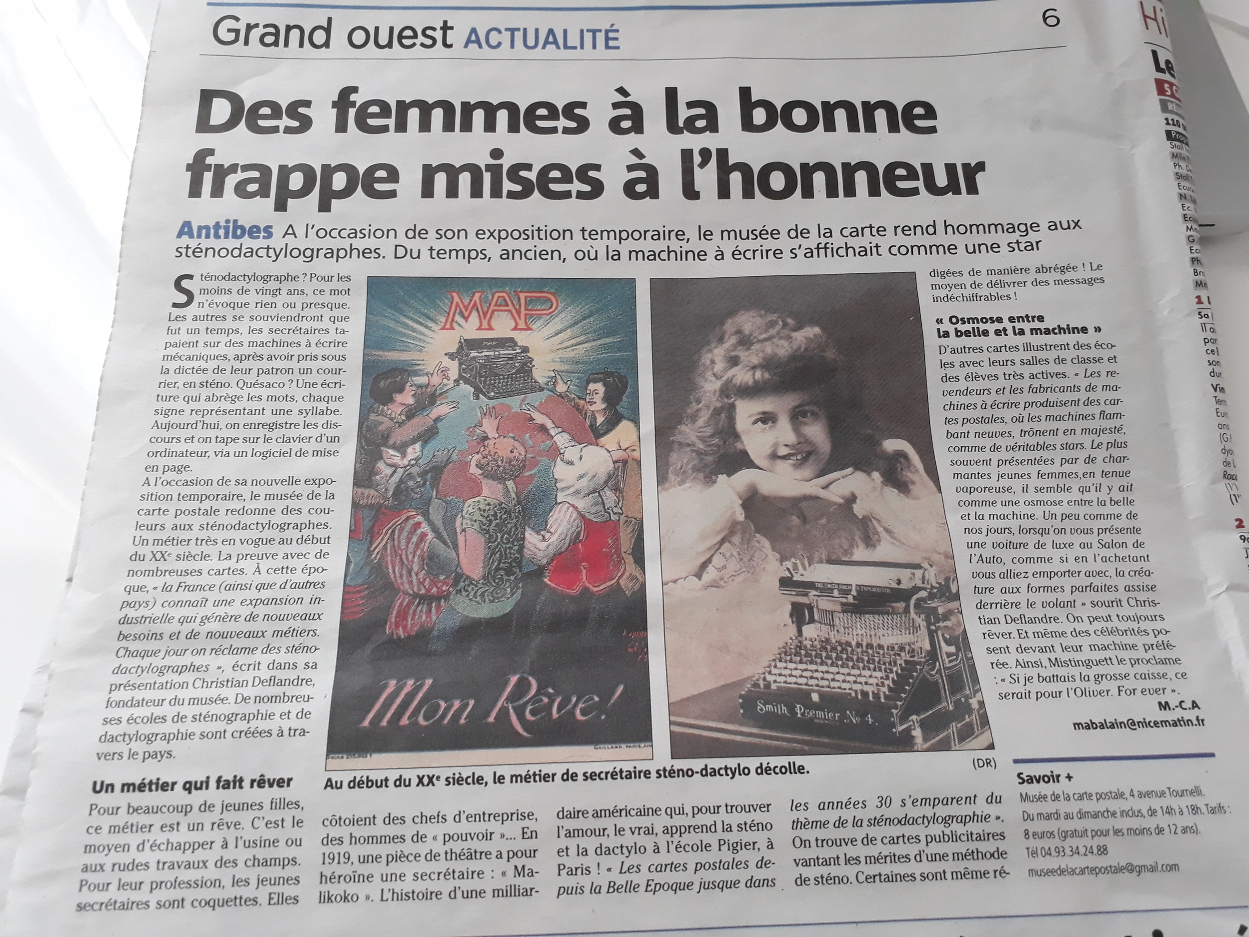 Un grand merci à Madame Abalain, journaliste à Nice Matin pour cet article sur la Sténodactylographie notre exposition temporaire au musée. L’article est en date du 13/01/2019, page 6.